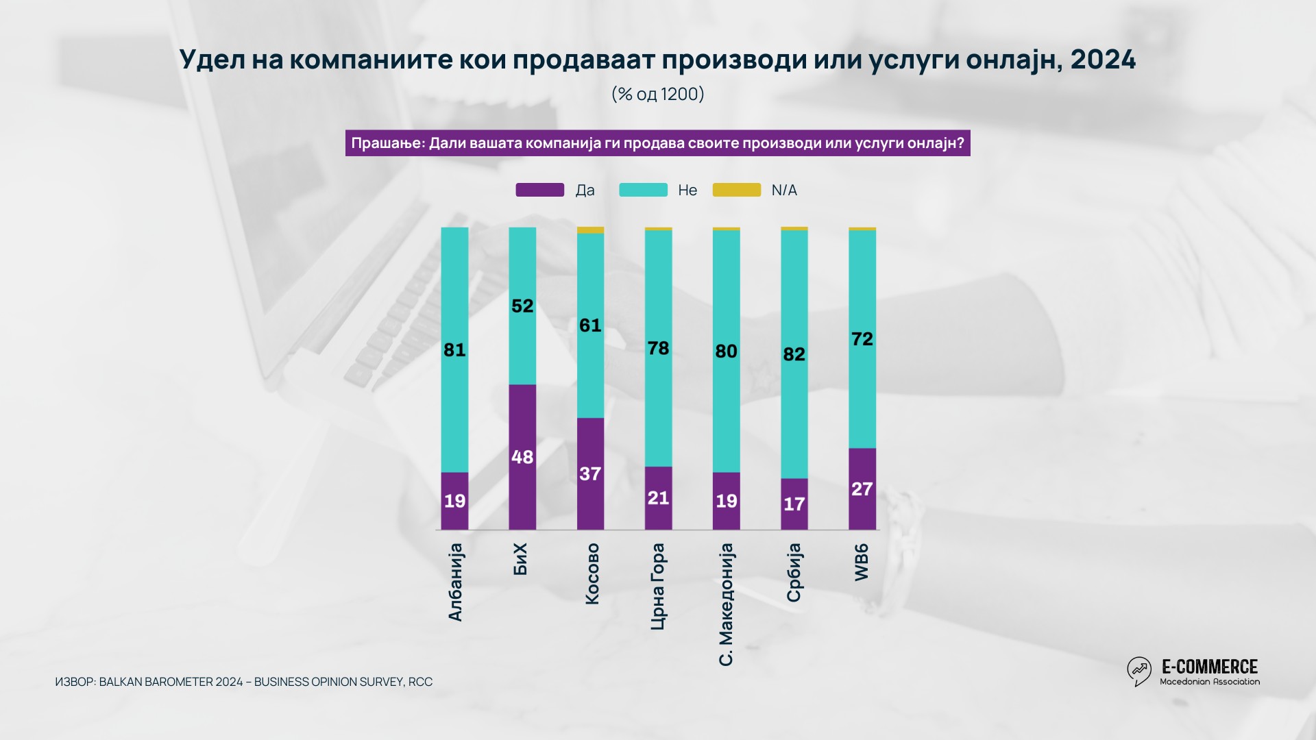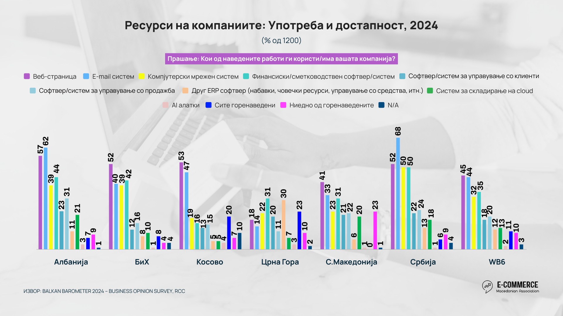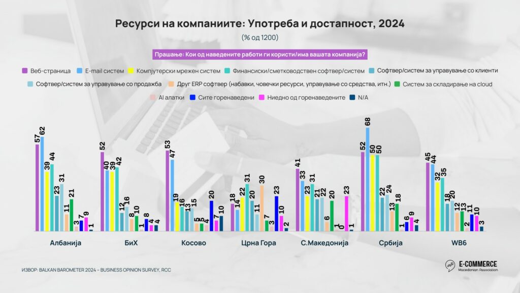 Во Прегледот на Е-трговијата во Западен Балкан, 2025 година изработен од Асоцијацијата за е-трговија, анализирани се податоците од анкетата во Бизнис барометарот за Западен Балкан 2024, спроведен од Регионалниот совет за соработка (RCC), која обезбедува редовен увид во состојбата, очекувањата и дигиталната подготвеност на компаниите во регионот. Истражувањето опфаќа 1.200 компании од Западен Балкан, по 200 од секоја економија, и прашалникот ги адресира клучните аспекти на деловното работење – вклучувајќи иновации, технологија и користење на е-трговијата.