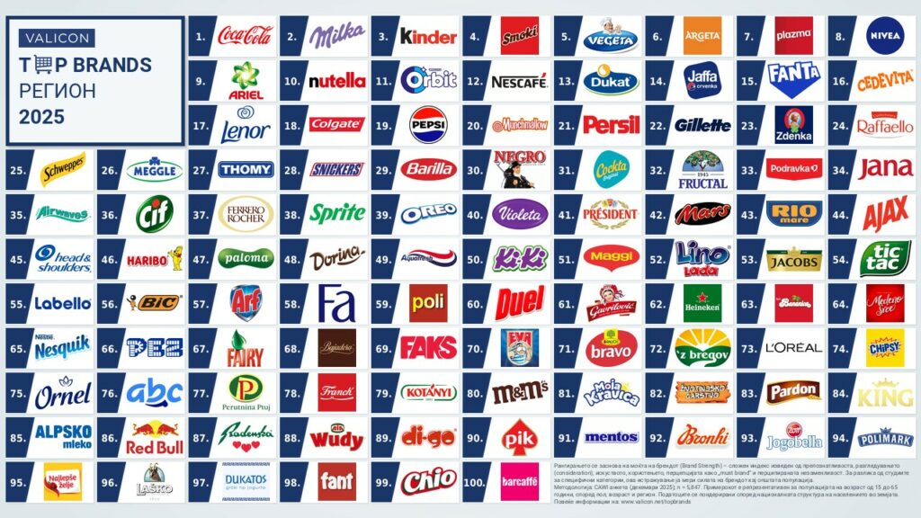 Иако на врвот на регионалната листа ТОП 100 брендови во регионот, доминираат глобалните гиганти како Coca-Cola и Milka, присуството на брендовите Смоки, Вегета и Аргета меѓу првите десет, е клучен индикатор за силата на локалните брендови. Овие регионални лидери докажуваат дека преку одржување на висока емоционална поврзаност и авторитет во својата категорија, можат успешно да се носат, па дури и да ги надминат светските конкуренти на домашен терен.