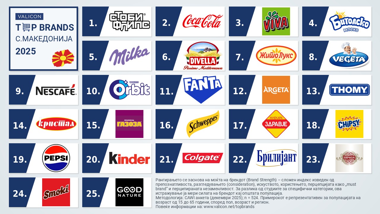 Северна Македонија претставува пазар на кој потрошувачите примарно го вреднуваат квалитетот и традицијата, поради што врвот на листата на ТОП 25 брендови во С. Македонија го сочинува силен спој на домашни лидери како Стоби Флипс, Вива сокови и Битолско млеко, во чекор со глобалните гиганти како Coca-Cola и Milka.