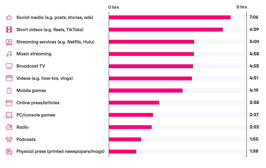 Луѓето денес поминуваат повеќе време на социјалните мрежи и на кратки видео содржини отколку пред телевизија, стриминг платформи и радио заедно.