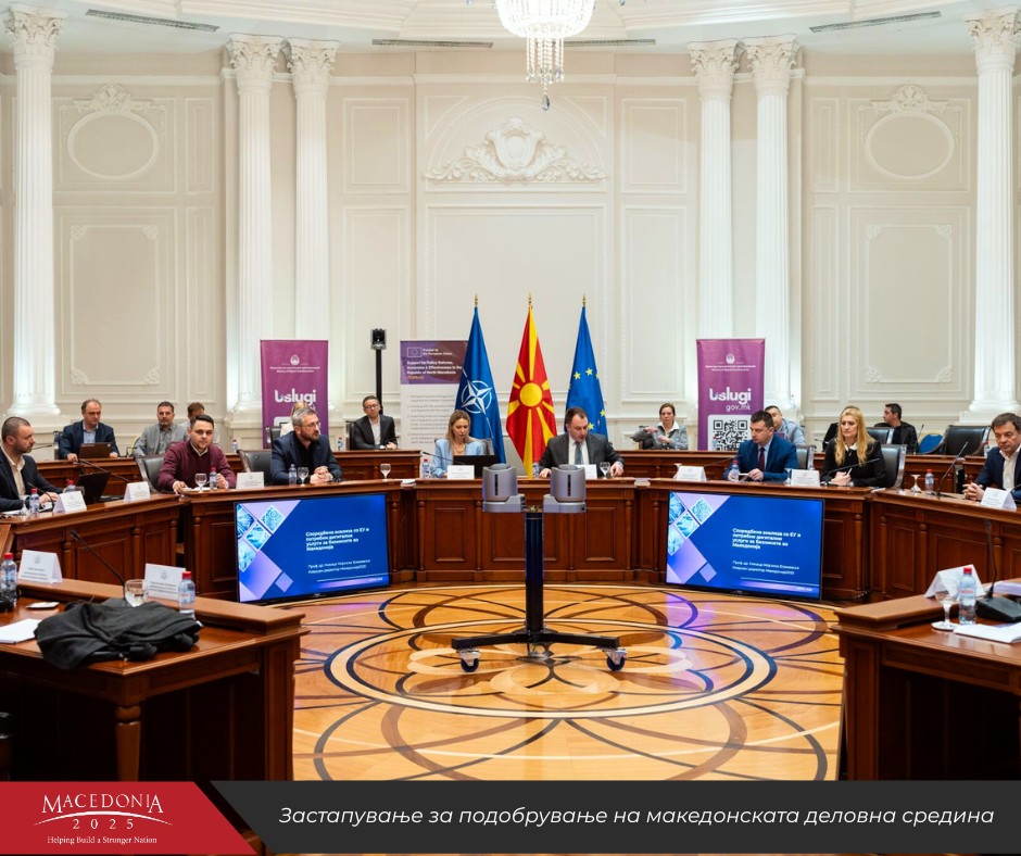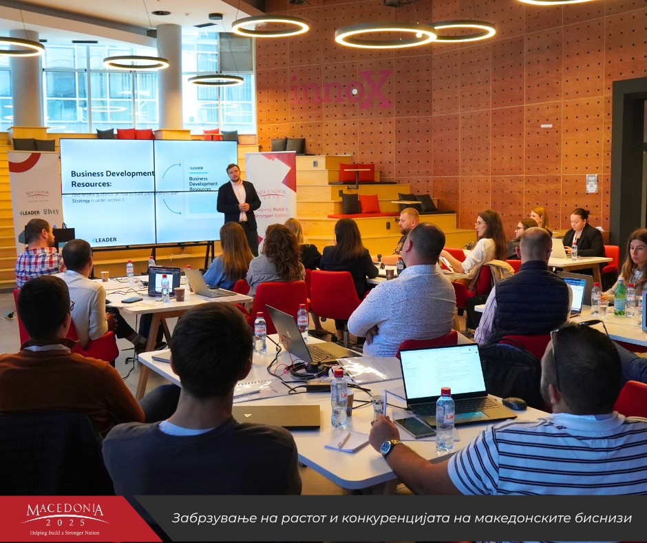 Паралелно, Македонија2025 продолжи континуирано да ја зајакнува бизнис-заедницата и човечкиот капитал преку програми насочени кон модернизација, дигитална трансформација и развој на лидерски компетенции. Преку Центарот за дигитална трансформација – GoDigital беа изработени 30 детални проценки на дигитална зрелост, 15 дигитални стратегии за компании и беше обезбедена практична техничка поддршка за пет компании во процесот на имплементација на нови дигитални решенија. Овие услуги им помогнаа на фирмите да го подигнат својот степен на конкурентност, да ги оптимизираат процесите и да воведат алатки што ја забрзуваат нивната интеграција во современите економски текови. Воедно, 553 професионалци и менаџери посетуваа специјализирани обуки, работилници и вебинари, со што се создаде поширока заедница на практичари кои активно ја применуваат стекнатата експертиза во своите организации. Како дел од напорите за градење силна генерација претприемачи, 27 млади менаџери и основачи на компании го надградија своето бизнис знаење преку реномираната обука што ја спроведе канадската Ајви бизнис школа во рамки на проектот „Лидер“, со што мрежата на алумни се прошири на 451 член.