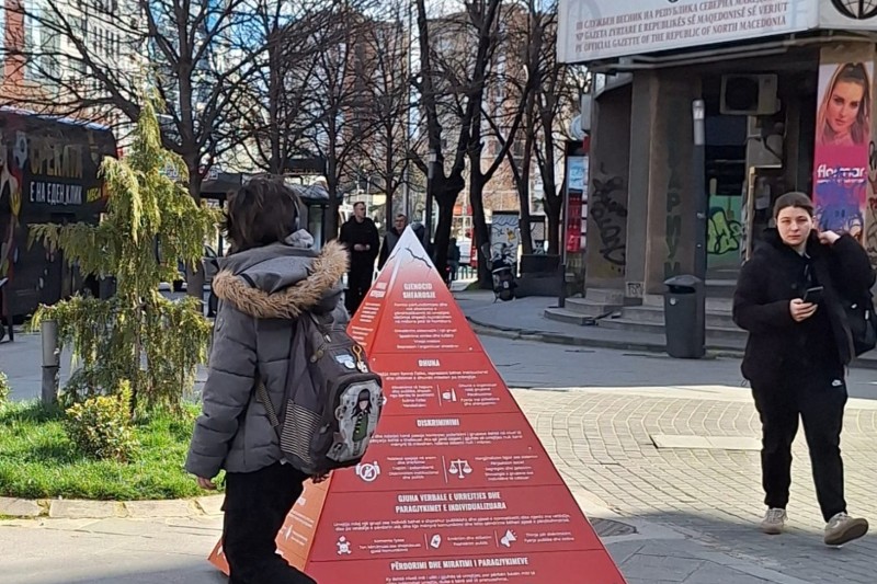 „Пирамидата на говорот на омраза“ поставена на плоштадот кај Ким на булеварот Партизански одреди е визуелна и едукативна структура која го прикажува постепеното ескалирање на омразата во едно општество, од навидум „невини“ предрасуди до најекстремните форми на насилство и истребување.
