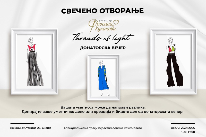 Во тој дух, Фондацијата упатува јавен повик до уметниците и креативците од целата земја да се вклучат во хуманитарната аукција што ќе се одржи во рамки на донаторската вечер насловена „THREADS OF LIGHT“, по повод официјалното отворање на Фондацијата, на 29 јануари во Станица 26 во Скопје. Настанот ќе вклучи изложба, аукција и промоција на химната на Фондацијата „Фросина Кулакова“.