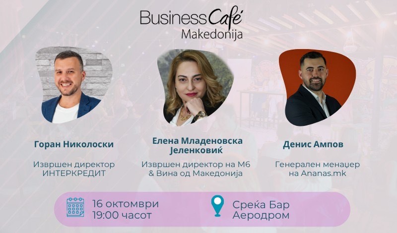 Новото 46-то издание на најпознатиот бизнис-нетворкинг настан во државата, Бизнис Кафе Македонија, ќе се одржи утре (16.10.2025) во „Среќа Бар“ во скопската населба Аеродром, со почеток од 19:00 часот.